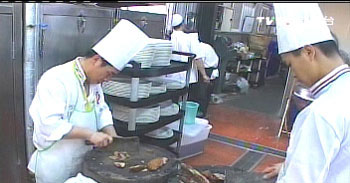 廚房里,43名大陸沙縣廚師忙里忙外,要籌備17道家鄉(xiāng)特色小吃,可不容易。豆腐、蛋白、再加點地瓜粉,充分?jǐn)嚢韬,加上一點鮮肉,放進(jìn)熱水中,這是沙縣特色的豆腐丸子。