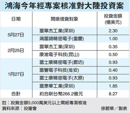 中新網(wǎng)5月28日電 據(jù)臺灣《經(jīng)濟(jì)日報》報道,臺當(dāng)局“經(jīng)濟(jì)部”投審會昨(27)日通過兩件鴻海集團(tuán)對大陸增資案,總計3.3億美元,約新臺幣106.2億元。一件是間接對富華杰工業(yè)(深圳)增資2.3億美元,另一件是對鴻富錦精密電子(重慶)間接增資1億美元。