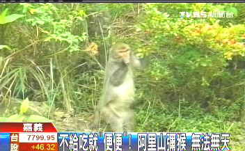 中新網(wǎng)12月21日電 據(jù)臺灣TVBS報道,阿里山現(xiàn)在也出現(xiàn)彌猴,猴子為了吃東西,還會雙手合十拜托民眾給香蕉吃,不過看到民眾不肯給,猴子居然調(diào)皮的,跳到民眾的車子上排泄,甚至還會把山上的花摘來吃,讓民眾好氣又好笑。