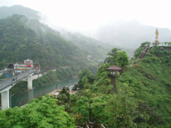 大約10分鐘,就爬上了觀音臺。觀音臺立有一座四十尺高,以青銅鑄造的觀音圣像,下方另一平臺,有一圓頂?shù)牡钐,祀奉觀音神像。觀音臺上,居高臨下,眺望遠(yuǎn)近山水,俯瞰坪林聚落,景色怡人。觀音臺步道沿途亦無遮蔭,陰涼天氣或雨中來訪皆宜,惟不宜艷陽高照日。