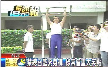更有民進(jìn)黨中常委戲稱:“穿運(yùn)動(dòng)服當(dāng)然要穿運(yùn)動(dòng)鞋。”陳明文笑稱:“要穿綠色內(nèi)褲,怎么穿藍(lán)的?”蔡同榮解釋道:“我其實(shí)是請(qǐng)人家做,不知道他要,忘了跟他講(什么色)!