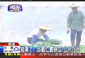 中新網(wǎng)7月20日電 據(jù)臺(tái)灣TVBS報(bào)道,臺(tái)當(dāng)局前“國(guó)安會(huì)秘書(shū)長(zhǎng)”邱義仁5月初南下高雄務(wù)農(nóng),經(jīng)過(guò)2個(gè)多月,他種的絲瓜現(xiàn)在已經(jīng)結(jié)實(shí)累累,3天前邱義仁開(kāi)始采收,10多箱的絲瓜經(jīng)由產(chǎn)銷班賣到臺(tái)北,1公斤的價(jià)格大概新臺(tái)幣18元,邱義仁的好友戴振耀說(shuō),受到臺(tái)風(fēng)影響,價(jià)格不算好,不過(guò)總算是邱義仁當(dāng)農(nóng)夫交出的第一張成績(jī)單。