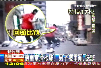 中新網(wǎng)7月23日電 據(jù)臺灣TVBS報(bào)道,新竹一名男子在車流量很高的市區(qū),騎車耍特技,把摩托車當(dāng)滑板,雙腳站在坐墊上,時(shí)速50公里前進(jìn),雖然才17秒鐘,但看起來險(xiǎn)象環(huán)生。