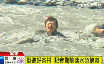 中新網(wǎng)8月17日電 據(jù)臺灣TVBS報道,屏東“好茶村”在風災中受重創(chuàng),多位記者隨村民挺進家園,希望能為外界報道受災情況,沒想到在橫渡“隘寮溪”時,一名攝影記者不小心被大水沖走,情況非常驚險,還好好茶村民經(jīng)驗豐富,立刻到下游淺水處一把拉住這名記者,人平安無事,但他手中緊握不放的攝影機卻毀了。