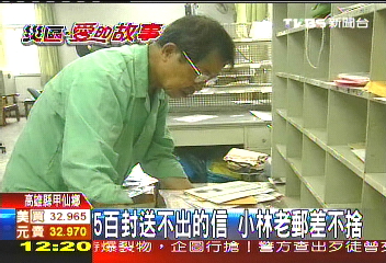 中新網(wǎng)8月19日電 高雄縣甲仙鄉(xiāng)小林村一夕之間滅村,甲仙郵局有一位專跑小林村的老郵差劉昭學(xué),他送信到小林村已經(jīng)有30多年,但臺風(fēng)到現(xiàn)在,累積成堆的小林村郵件,已經(jīng)2大箱,大約500多封信如今成了無法投遞的郵件,老郵差滿是遺憾和不舍。