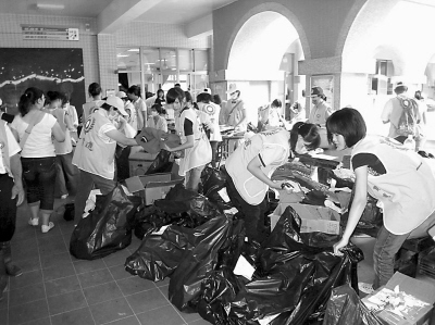在熱心志工的引導(dǎo)下,我們進(jìn)入旗山社會(huì)福利館。這兒似乎被一個(gè)社會(huì)團(tuán)體的志工包下了,統(tǒng)一的黃色馬甲顯得整齊,記者在人群中明顯不一樣。一間大房間作為庫(kù)房,不同的物資碼放整齊。更多的人忙著將一袋袋捐贈(zèng)衣物分門別類,新的舊的,長(zhǎng)的短的,厚的薄的,男的女的,然后消毒、打包、標(biāo)號(hào),送往災(zāi)民安置點(diǎn)。