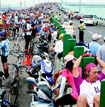 縣政府原計劃將無車日活動設(shè)在板橋文化路的捷運(yùn)新埔站,要車友在這里集結(jié)上橋,后來報名參加車友實(shí)在太多,昨天緊急調(diào)整通車典禮會場至臺64線道路的16.3公里處,也就是五股交流道附近。沒想到清晨4時起就有車友成群結(jié)隊上橋,卻在16.3公里處被擋駕,他們耐心等候7時30分通車典禮,沒想到因人太多,近七萬車友和愛車就硬被堵在高架橋上。
