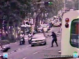 警匪正面駁火,兩人相隔一個(gè)車道,距離還不到4米,身中多槍的嫌犯多次跌倒又爬起,所幸最后終于被制伏。根據(jù)監(jiān)視器畫面,當(dāng)時(shí)正好是綠燈,警匪槍戰(zhàn)活生生在街頭上演,摩托車騎士急忙倒退,還有人趕緊繞跑。