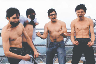 學生們在景觀臺上一字排開,女同學一聲令下,有3人先脫掉上衣,露出結(jié)實的肌肉,但第4人僅做象征性的配合,將胸前的衣服拉高,臉部還戴著口罩,遭到女同學大聲糾正。