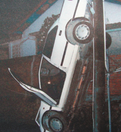 但因為他那時已經喝茫,加上天雨、視線不清楚,且車尾面對陡下坡,竟然就這樣沿著電線桿的接地線開上電桿、發(fā)出“碰”一聲巨響,整臺車頭下腳上倒立、貼在電桿上,兩人簡直嚇壞了。幸好前座在下方,兩人趕緊開車門出來。