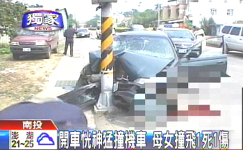 中新網(wǎng)3月4日電 據(jù)臺(tái)灣TVBS報(bào)道,南投縣草屯今天發(fā)生一起死亡車禍,轎車駕駛疑似恍神,直接撞上騎摩托車雙載的母女,車被撞飛了10米遠(yuǎn),坐在后座的媽媽雖然有戴安全帽,但因?yàn)樗は萝嚂r(shí),被轎車撞上頭部,當(dāng)場(chǎng)傷重不治。