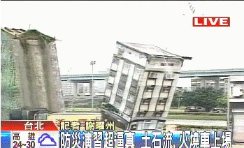 臺北縣下午進(jìn)行災(zāi)害演習(xí),其中有個片段是模擬強(qiáng)臺來襲時,橋梁斷裂,造成轎車掉入橋中火燒車。