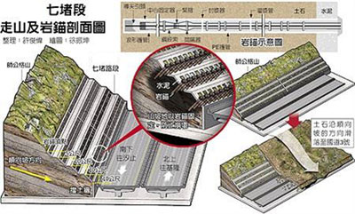 臺“國工局”規(guī)劃組人員26日調出1993年的設計規(guī)劃資料,帶著設計圖到現場比對,發(fā)現災變段地質狀況與設計之初無異,地層滑動方向也是順向坡,但下方巖錨抓力擋不住山頭高點的山崩,初步判斷極可能是山崩規(guī)模和范圍超出當時巖錨防護設計。