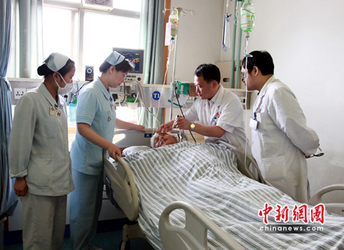 中新網(wǎng)長沙5月6日電(劉柱 伍西明)“多虧醫(yī)院救了我丈夫的命,歡迎你們來臺(tái)灣做客!”在湖南湘雅醫(yī)院重癥醫(yī)學(xué)科(ICU病房),剛剛從臺(tái)灣趕來長沙的臺(tái)胞患者梁登輝的夫人對病房里的醫(yī)生和護(hù)士們連聲感謝。