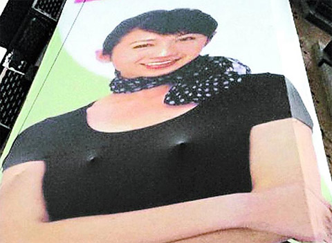 中新網(wǎng)5月19日電 據(jù)臺灣《蘋果日報(bào)》報(bào)道,臺北市信義路、松仁路口的臺北市議員許淑華競選廣告帆布廣告牌,于20多天前設(shè)立,因當(dāng)時晚上施工的人員未拆下帆布后方凸出鐵條,導(dǎo)致廣告上胸部位置有兩點(diǎn)凸起,造成“激凸”效果。