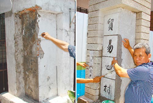 中新網(wǎng)5月20日電 據(jù)臺灣《聯(lián)合報》報道,臺南縣仁德鄉(xiāng)二空眷村將拆除改建大樓,包商日前把村門口由宋美齡落款題字“貿(mào)易四村”的石柱拆除,遭眷戶抗議并報警,指軍方與包商竊盜眷村文物。包商昨天把落款貼回,但損裂痕清楚可見。