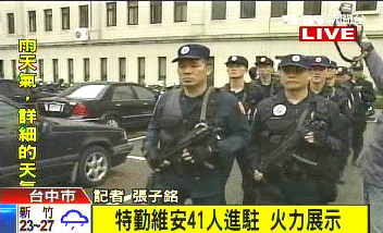 中新網(wǎng)6月2日電 據(jù)臺灣TVBS電視臺報道,臺中市接連發(fā)生重大刑案,維安特勤小組今日下午再次進駐臺中市,每名特勤隊員都配備了精良的武器裝備。不過警方表示,這次維安特勤人員進駐,穩(wěn)定力量將多過于實質(zhì)破案的績效。
