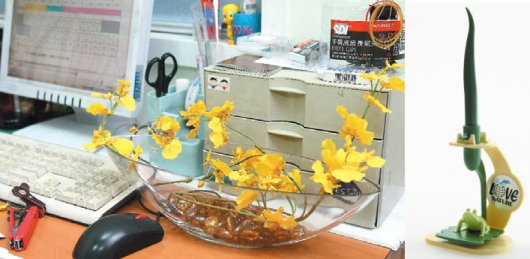 此外,還可在座位靠走道或鄰近人往來走動的那一面,擺放會規(guī)律性旋轉(zhuǎn)、擺動的對象,如點(diǎn)頭娃娃,因?yàn)橐?guī)律擺動的事物可讓周圍空氣流轉(zhuǎn),氣場流暢,做事也就會比較順利,如果你是老板,甚至可以大方擺個(gè)流水球,更有氣勢。主管級的人,辦公桌上或可擺放陣仗較大的流水。