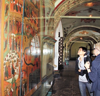周美青在俄方人員陪同下參觀了修道院,并進入院內的一間教堂,她對教堂內東正教的圣像畫特別感興趣,其中一幅壁畫“末世的審判”描繪東正教里人與天地的關系,以及天堂與地獄的對比,周美青在壁畫前駐足良久仔細欣賞,似乎對東正教信仰有所體會。