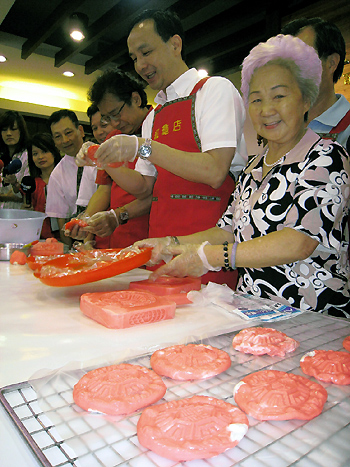 中新網(wǎng)6月22日電 據(jù)“中央社”報(bào)道,國民黨新北市長參選人朱立倫22日到汐止市百年紅龜粿店,與75歲的劉余銀奶奶一起做紅龜粿,朱立倫毫不生疏、架勢十足,讓老奶奶猛稱贊,并給了他90分的高分。