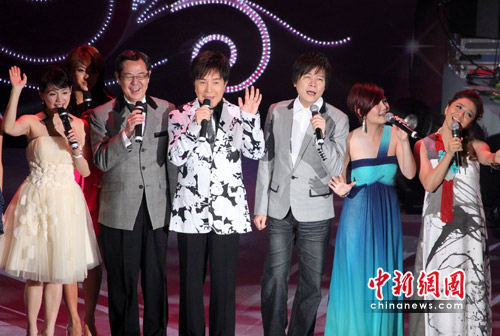 5月8日,一代巨星鄧麗君逝世滿15周年,“但愿人長久—鄧麗君金曲慈善演唱會”當(dāng)晚在臺北登場,14位老中青實力派歌手演繹35首鄧麗君不同時期的經(jīng)典歌曲,令數(shù)千觀眾聽得如癡如醉。圖為演唱會尾聲,馬來西亞著名歌手梁靜茹(右2)、曾與鄧麗君搭檔的臺灣老歌手謝雷(左3)、“寶島閩南語歌王”洪榮宏(右3)、“小鄧麗君”蔡幸娟(左1)等人合唱《Goodbye My Love》。中新網(wǎng)駐臺記者 董會峰攝
