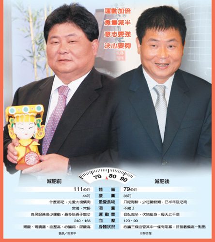 他說,“阿標(biāo)減肥秘方”是“運(yùn)動加倍、食量減半、意志要強(qiáng)、決心要夠”四句箴言,愿獻(xiàn)給全臺的胖哥、胖嫂。