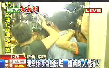另?yè)?jù)TVBS報(bào)道,今天上午開庭時(shí),護(hù)衛(wèi)隊(duì)一路護(hù)送陳幸妤但一度爆發(fā)推擠。負(fù)責(zé)護(hù)送陳幸妤的護(hù)衛(wèi)隊(duì),一看到媒體鏡頭,馬上用雨傘不斷遮擋,場(chǎng)面混亂。