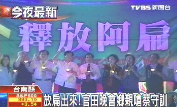 據(jù)臺灣TVBS電視臺報道,臺灣本土社團昨天晚上在臺南縣官田鄉(xiāng)西莊惠安宮前廣場舉辦“釋放阿扁”晚會,數(shù)百名陳水扁支持者不時高喊口號,最后一起點燃蠟燭,希望陳水扁能在今天獲釋。