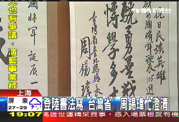 據(jù)臺(tái)媒報(bào)道,在上海的書畫展中,臺(tái)北縣長(zhǎng)周錫瑋送去的書法,上面落款寫的是“臺(tái)灣省臺(tái)北縣長(zhǎng)周錫瑋”,“臺(tái)灣省”三個(gè)字引發(fā)島內(nèi)討論。
