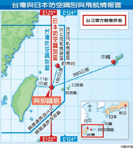 臺日軍方的防空識別區(qū)界線設(shè)在東經(jīng)123度,而民航機的航管界線卻在東經(jīng)124度,在空域上重迭了一度,相當60浬的距離,成為雙方爭執(zhí)的主要原因。