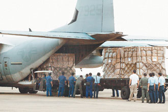 據(jù)了解,這批美方捐助的大型防水布,是美國海軍陸戰(zhàn)隊使用的特殊軍用品,可以在災區(qū)興建組合屋時鋪在地上防水、防雨之用。