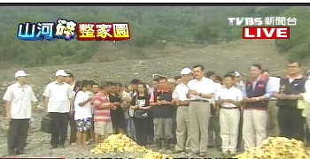 而馬英九到了遭土石掩埋的新開部落,也在當(dāng)?shù)胤傧慵腊萃稣,神情凝重;在進入新開部落前,會經(jīng)過日前災(zāi)民立牌寫著“32人死亡,SOS”的新寶橋,因為橋斷了,施工單位先在河床鋪上便道,讓車子可以通過。