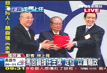 中新網10月17日電 馬英九17日上午接任中國國民黨主席,與吳伯雄進行交接儀式,接下黨主席印信,傳承黨旗。