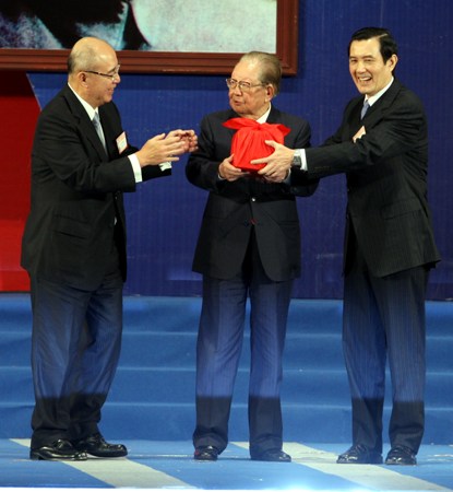 在主席監(jiān)誓人、國民黨選監(jiān)委員會召集人邱創(chuàng)煥的監(jiān)交下,馬英九從卸任黨主席吳伯雄手中接下印信、黨旗,宣告“馬主席時代”來臨,國民黨將邁向以黨輔政的“完全執(zhí)政、完全負(fù)責(zé)”新局。