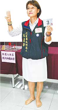 花蓮縣長(zhǎng)國(guó)民黨提名的杜麗華昨打赤腳抽簽,抽到3號(hào),喊出:“頭頂青天、腳踏實(shí)地,一步一腳印,邁向成功。。