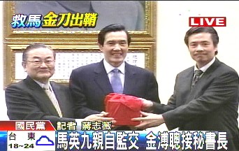 國(guó)民黨新舊秘書(shū)長(zhǎng)交接儀式上,金溥聰從詹春柏與馬英九的手上接下印信,報(bào)道稱,這象征其扛下國(guó)民黨這部大機(jī)器的開(kāi)始。