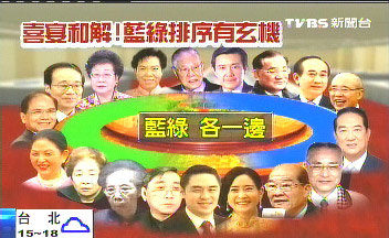 據(jù)報(bào)道,主桌最重要的位子是證婚人李登輝,再來(lái)是馬英九,順時(shí)針依序是連戰(zhàn)、王金平、吳伯雄、宋楚瑜、吳敦義、黃昆輝。而另一頭,李登輝夫婦旁邊,是呂秀蓮,民進(jìn)黨時(shí)代的“閣揆”張俊雄、游錫堃,藍(lán)綠雖然同桌,但壁壘分明,分坐兩邊。