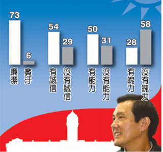 從領(lǐng)導(dǎo)人的誠信特質(zhì)來看,有54%民眾相信馬英九的誠信,僅29%認(rèn)為馬英九缺乏誠信;至于個人能力方面,則有50%民眾肯定馬英九的能力,31%覺得他的能力待加強(qiáng)。