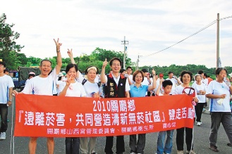 昨天清晨的全民健行活動有3000鄉(xiāng)民參與,山西宮主委張伯祿、副主委汪忠政等率隊出發(fā),一路走到風(fēng)景優(yōu)美的大潭埤旺萊公園,關(guān)廟衛(wèi)生所配合舉辦反煙倡導(dǎo)、衛(wèi)教倡導(dǎo)活動。
