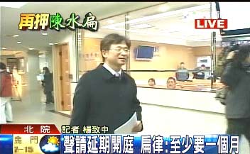 中新網1月14日電 據(jù)臺灣TVBS報道,陳水扁律師石宜琳14日下午出現(xiàn)在北院,他在4點遞狀,聲請1月19日至21日的準備程序庭延期,他以卷宗太多尚未看完,以及律見30分鐘無法與扁詳細討論案情為理由,希望延期至少1個月。