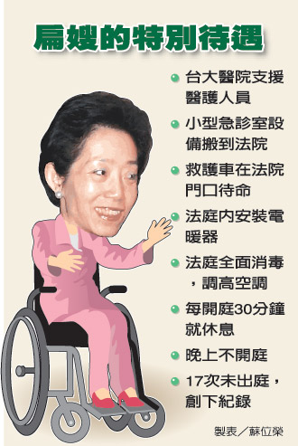 除了基本的醫(yī)療戒護,臺北地院擔(dān)心長時間開庭,虛弱的吳淑珍會撐不住,每開庭30分鐘就休庭10分鐘,庭訊預(yù)計3小時,而且晚上不開庭,甚至在律師進行答辯時,吳淑珍還可以到一旁的第八法庭稍作休息。這樣的高規(guī)格對吳淑珍,就是要讓審理過程更加順利。