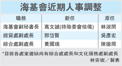中新網(wǎng)2月17日電 據(jù)臺灣《經(jīng)濟日報》 報道,第三次陳江會前夕,臺灣;鶗ⅰ瓣懳瘯眱蓵{(diào)整談判團隊。海基會董事長特別助理高文誠近日將接掌;鶗泵貢L,“陸委會”主委賴幸媛核心幕僚詹志宏日前恢復單純咨詢委員職務,賴幸媛也聘請學者施威全擔任機要秘書。