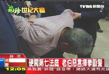 中新網(wǎng)2月26日電 據(jù)臺灣TVBS報(bào)道,陳水扁連續(xù)3天開庭,庭外依舊鬧哄哄,今天一名70多歲的老伯,在開庭后硬要闖入第七法庭,鬧場舉動(dòng)引來法警關(guān)切,沒想到老伯面對人數(shù)眾多的法警,不但口出惡言,還出手打人,法警忍無可忍,最后強(qiáng)制執(zhí)行公權(quán)力趕人。
