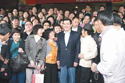 馬英九于前晚夜宿嘉義市中信飯店,1日一早在飯店前,巧遇100多名大陸旅客,都擠著要和他合影,馬英九索性主動(dòng)走入大陸游客群中來個(gè)大合照。
