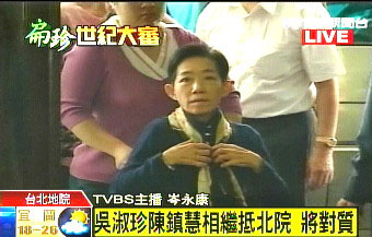 中新網(wǎng)3月17日電 據(jù)臺灣TVBS報道,17日下午2點24分,陳水扁夫人吳淑珍穿著藍色針織毛衣,披著絲巾,在兒子陳致中的陪同下,進入法院。陳鎮(zhèn)慧則是戴著大墨鏡,白外套、黑上衣,低調進入法院。今天首次進入實質審理,雙方對質,備受注目!