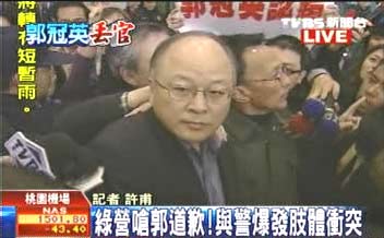 中新網3月31日電 綜合臺灣媒體報道,因以“范蘭欽”為名撰寫“辱臺”文章而遭免職的臺當局前“新聞局”駐外官員郭冠英今日清晨搭機返臺,支持者反對者前往接機引發(fā)現(xiàn)場沖突。郭冠英則略顯蒼白的表情,顯得有些鐵青沉重。后來甚至發(fā)生座車和媒體車發(fā)生擦撞事件。