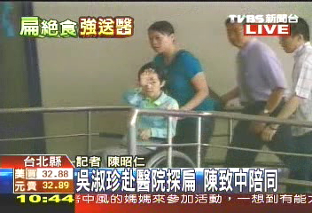 中新網(wǎng)5月11日電 據(jù)臺(tái)灣TVBS報(bào)道,陳水扁因?yàn)榻^食身體虛弱遭到強(qiáng)制送醫(yī),目前仍在臺(tái)北縣立板橋醫(yī)院接受治療。陳水扁夫人吳淑珍偕同兒子陳致中11日上午來(lái)醫(yī)院特見陳水扁。
