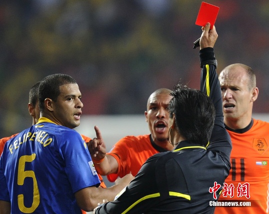 中新網(wǎng)7月3日電 巴西隊1比2被荷蘭隊淘汰,球隊的中場大將梅洛成為頭號罪人。不過,賽后這名在比賽中既擺烏龍又吃紅牌的后腰表示羅本太愛表演,自己是冤枉的,如果自己玩真的,羅本當(dāng)場就給廢了。