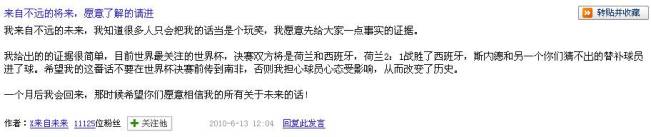 “X來自未來”的ID注冊于6月13日。該網(wǎng)友還表示,“希望我的這番話不要在世界杯決賽前傳到南非,否則我擔(dān)心球員心態(tài)受影響,從而改變了歷史。一個月后我會回來,那時候希望你們愿意相信我的所有關(guān)于未來的話!”
