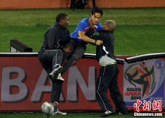 主裁判立即吹停了比賽,這位球迷最終也“束手就擒”。盡管他沒有襲擊任何隊員的意向,也沒有做出其他過激舉動,但他能這么輕松地沖進(jìn)場內(nèi),顯然讓南非世界杯組委會的安保人員大跌面子,而且就在比賽結(jié)束后,又有一名脫掉上衣的男性球迷沖入場內(nèi)。世界杯的安保正被敲響警鐘,尤其是——決賽很快就要到來了!